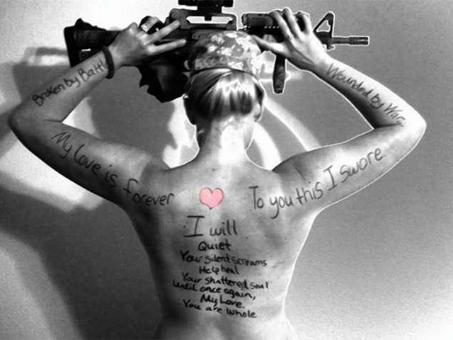 Стало ясно, что помощи ждать неоткуда, и она решила действовать самостоятельно. Раздевшись по пояс, женщина сфотографировала себя со спины, держа в руках автомат. Перед этим подруга написала на ее спине слова клятвы, адресованной Роберту Вайс: "Сломленный в боях… Израненный войной… Я всегда буду любить тебя - клянусь! Я пойду на все, чтобы излечить твою душу".
