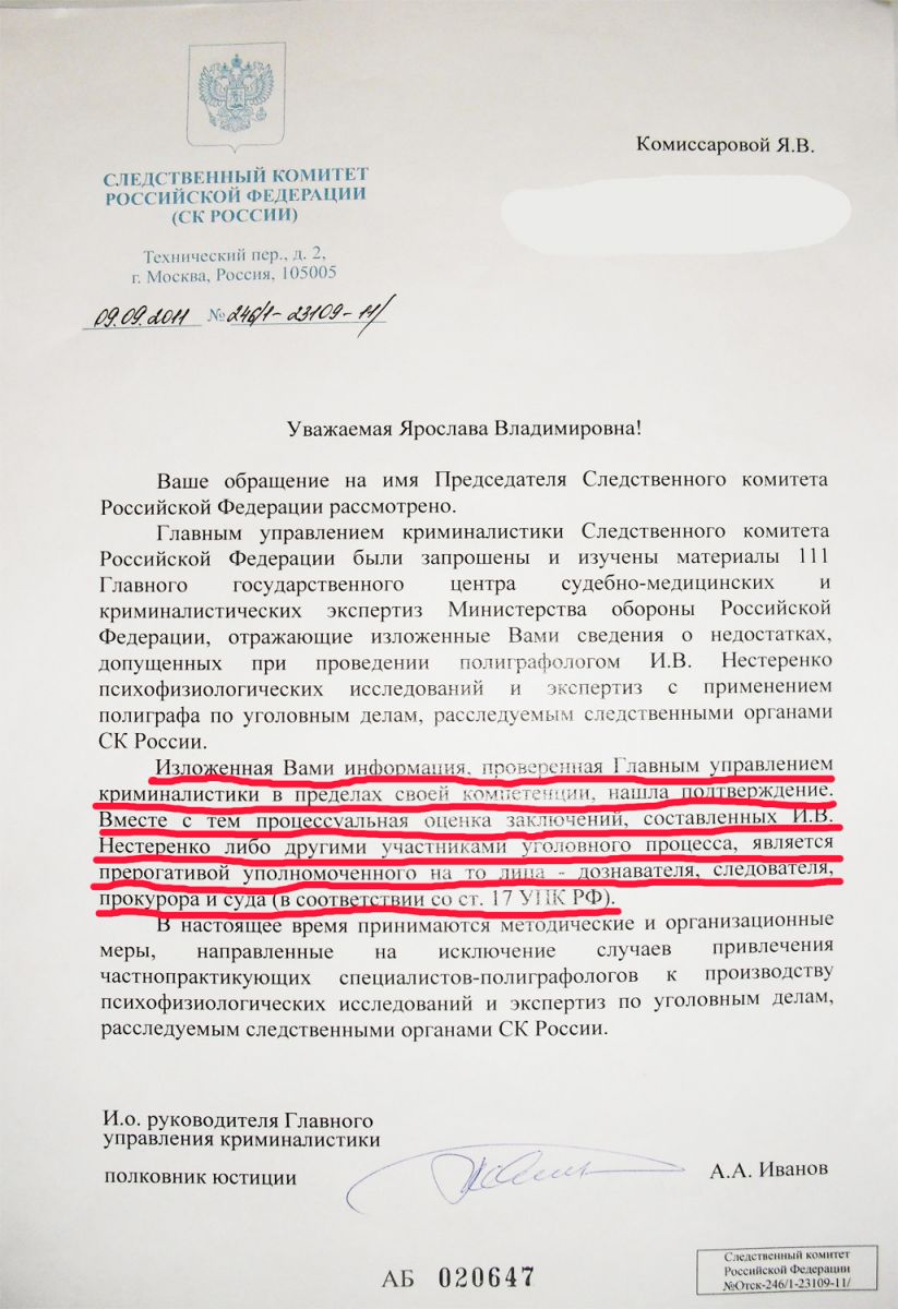 Так, в ответ на обращение в СК от Ярославы Комиссаровой по поводу недостатков, допущенных при проведении экспертиз с использованием полиграфа по уголовным делам, и. о. руководителя Главного управления криминалистики ответил, что изложенная ею информация нашла свое подтверждение, вместе с тем процессуальная оценка заключений, составленных Нестеренко, является прерогативой дознавателя, следователя, прокурора и суда.