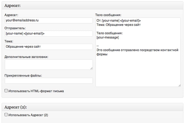Сохранив достигнутый результат с помощью кнопки Сохранить, обратим свое внимание на раздел Адресат. Он предназначен для настроек email-сообщения, которое будет отправляться с данными, собранными через форму. Указанные в нем параметры должны соответствовать параметрам формы, в противном случае часть информации может быть потеряна. Во-первых, необходимо проверить и при необходимости изменить адрес получателя email. Имя отправителя формируется по шаблону в соответствии с полями формы. Так как из формы мы удалили поле темы, то в данном разделе в качестве темы необходимо указать какой-либо постоянный текст, чтобы иметь возможность идентифицировать сообщения — например, Обращение через сайт. Аналогичные изменения необходимо произвести и в поле Тело сообщения, позволяющем настраивать шаблон содержания отправляемого письма.