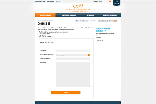 The Michael J.Fox Foundation представляет контактную форму вместе с остальной контактной информацией на отдельной странице, предлагая выбрать тему сообщения из выпадающего списка.