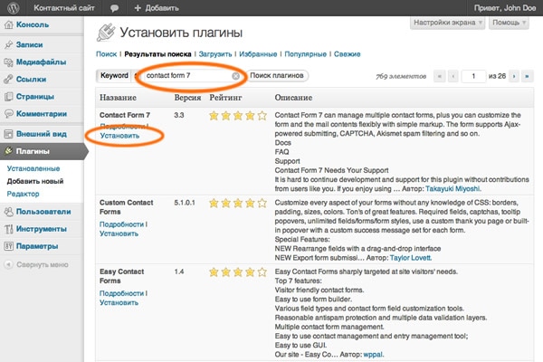 Установить плагин можно прямо из административной части WordPress. В разделе Плагины -> Добавить новый укажите в строке поиска название Contact Form 7 и затем в списке предложенных вариантов выберите Установить для соответствующей позиции. После завершения установки активируйте плагин, нажав на соответствующую ссылку.