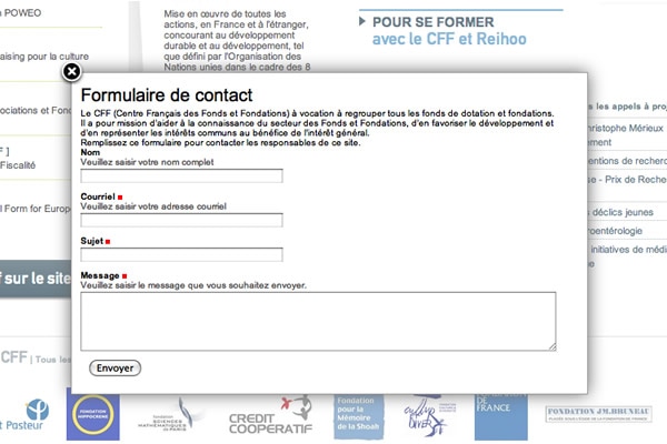На сайте Французской ассоциации филантропических организаций контактная форма появляется в виде модального диалога.