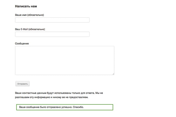 После отправки формы необходимо проинформировать посетителя о том, что его сообщение действительно передано. Наиболее простой способ – вывести на экран уведомление. Иногда осуществляется перенаправление посетителя на другую страницу с таким уведомлением, но такое поведение воспринимается как неожиданное, и лучше использовать его в качестве «подстраховки», например, в случаях отключенного JavaScript.