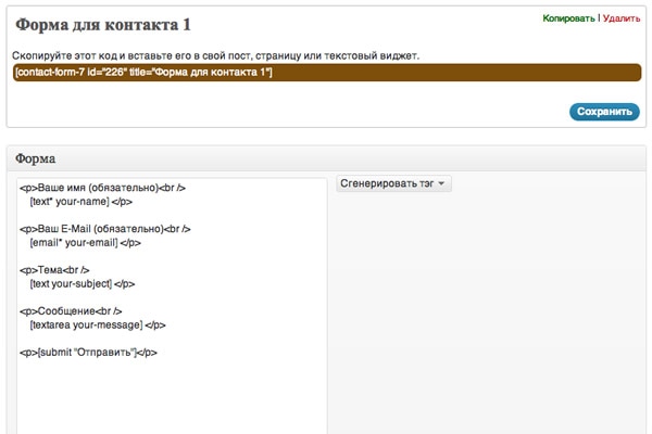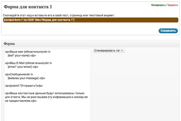 Экран редактирования формы содержит несколько областей. Подробнее об их назначении и доступных опциях вы можете прочесть в документации к плагину. Но общий принцип следующий – каждое поле формы представлено в виде специального кода (тэга) заключенного в квадратные скобки [ ]. Остальные элементы формы (подписи, подсказки и т.п.) форматируются с помощью стандартных тэгов HTML. Если вы совсем не знакомы с HTML, то, возможно, наступило время обратиться к нетленной серии «для чайников», а именно книге «HTML, XHTML и CSS для чайников», изданной на русском языке издательством Диалектика, и прочесть из нее хотя бы первые 140 страниц. Поверьте, и вы и ваш сайт от этого только выиграете.
