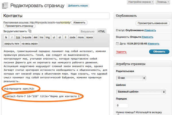 Последний шаг, который нам необходимо предпринять для появления формы на сайте, — это копирование специального кода формы в верхней части экрана (выделен коричневым цветом) и вставка его в конец текстового содержания страницы Контакты. Вставленный код также можно сопроводить заголовком, например Напишите нам.