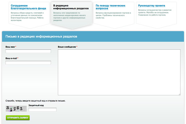 К сожалению, многие некоммерческие организации на своих сайтах не уделяют контактной информации вообще и контактной форме в частности должного внимания. Иногда они и вовсе отсутствуют. А между тем, контактная форма является важным инструментом прямой коммуникации (иногда единственно возможным) между организацией, проектом и посетителями сайта, которые, в свою очередь, могут выступать в различных ипостасях – от нуждающегося в помощи до потенциального партнера.