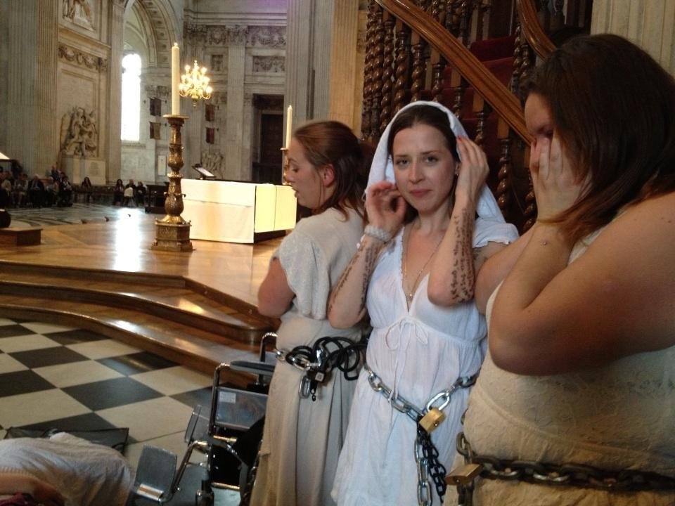Четыре девушки в подвенечных платьях забежали в храм и разместили на алтаре зонтик с цитатой из Библии «Изгоните менял из храма», а потом приковались наручниками и цепями. Согласно заявлению Occupy London, акция была проведена в соборе Святого Павла, так как настоятель храма поддержал изгнание демонстрантов с Трафальгарской площади в феврале 2012 года.