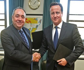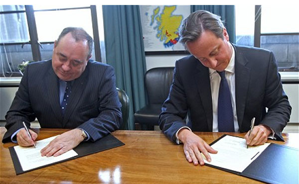 Премьер Великобритании Дэвид Кэмерон и шотландский первый министр Алекс Салмонд подписали в понедельник соглашение о проведении осенью 2014 году референдума, посвященного независимости Шотландии. На нем будет поставлен всего один вопрос и даны два варианта ответа - «да» или «нет», передает Reuters.