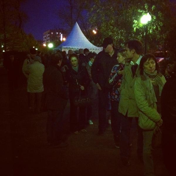 Для голосования нужен мобильный телефон и паспорт. На мобильный придет специальный код, который нужно будет сообщить при голосовании. В очереди к палаткам люди стоят, в среднем, час. Со сцены публику развлекают чтением стихово про Удальцова и НТВ.