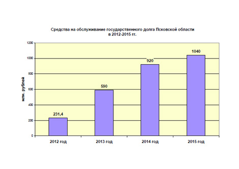 Как следствие нарастания объема государственных внутренних заимствований, на обслуживание государственного долга области в 2012 году потрачено 231,4 млн. руб. (2% бюджета), в 2013 году запланировано 590 млн. руб. (3% планируемого бюджета), в 2014 году – 920 млн. руб. (5% планируемого бюджета), в 2015 году – 1 млрд. 40 млн. руб. (5% планируемого бюджета).