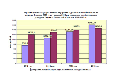 Пределом допустимого государственного внутреннего долга для регионов является 100% от собственных доходов бюджета, но до 1 января 2017 года дана «поблажка»: долг может превышать 100% на сумму привлекаемых бюджетных кредитов, и авторы бюджета Псковской области на 2012 и последующие годы этой возможностью воспользовались.