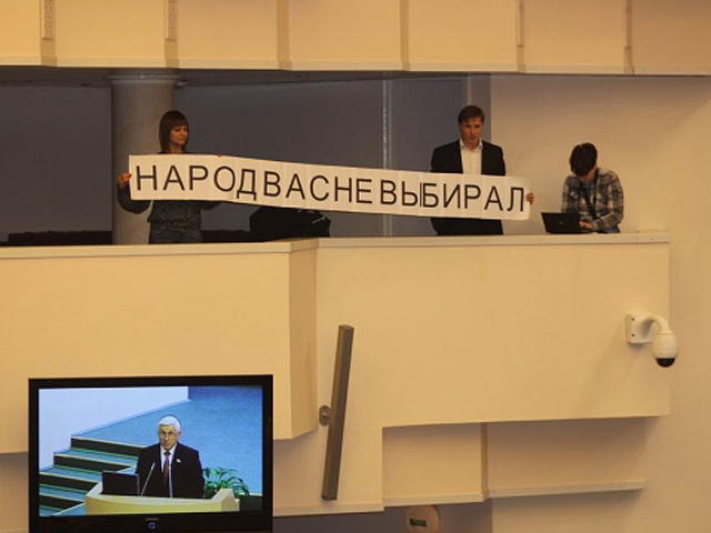 Оппозиция попыталась оживить первое заседание пятого созыва Саратовской областной думы. Как передает "Взгляд", во время выступления председателя регионального парламента Владимира Капкаева двое молодых людей, сидящих на балконе, подняли плакат с текстом: "Народ вас не выбирал".