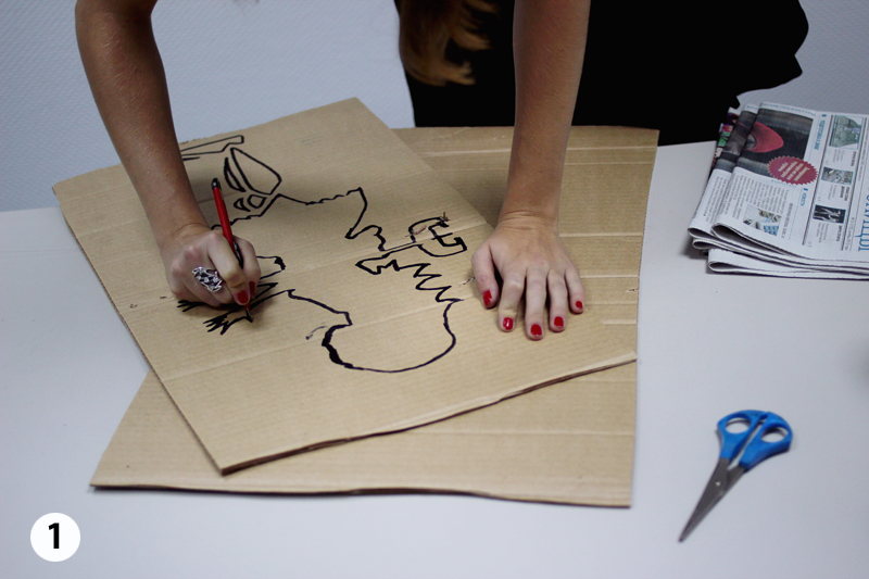 "Сегодня мы будем делать вот такую заводную куклу — это достаточно простой однослойный трафарет. Мы нарисовали его от руки на листе картона. Он крупный, нет никаких тонких линий, так что мучиться не надо будет. Главное — выбрать толстый картон. Для изготовления трафарета тонкая бумага не подходит — она может намокнуть от краски и порваться".