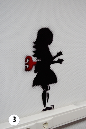 "Мы хотим сделать двухцветное граффити (в нашем случае мы закрасим ключик от куклы другой краской) — для этого нам надо подождать, пока краска подсохнет, поставить трафарет обратно на граффити и закрыть рисунок листами бумаги так, чтобы открытой осталась лишь та часть, которую мы хотим покрасить. Красим".