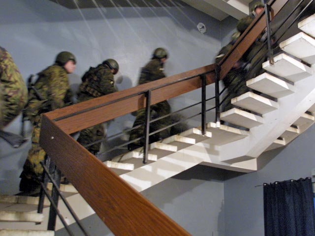Один из путей прохода спецназа в здание центра был разведан заранее: под прикрытием снайперов бойцы проникли внутрь и исследовали технические помещения. Там же обнаружили нескольких рабочих, двое суток скрывавшихся в коммуникациях. Именно они впоследствии помогли военным разработать план штурма.