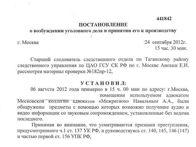 Член Координационного совета оппозиции Алексей Навальный заявил о возбуждении уголовного дела по факту обнаружения в августе 2012 года прослушивающих устройств в офисе Фонда борьбы с коррупцией, главой которого он является. Об этом оппозиционер заявил в своем ЖЖ.