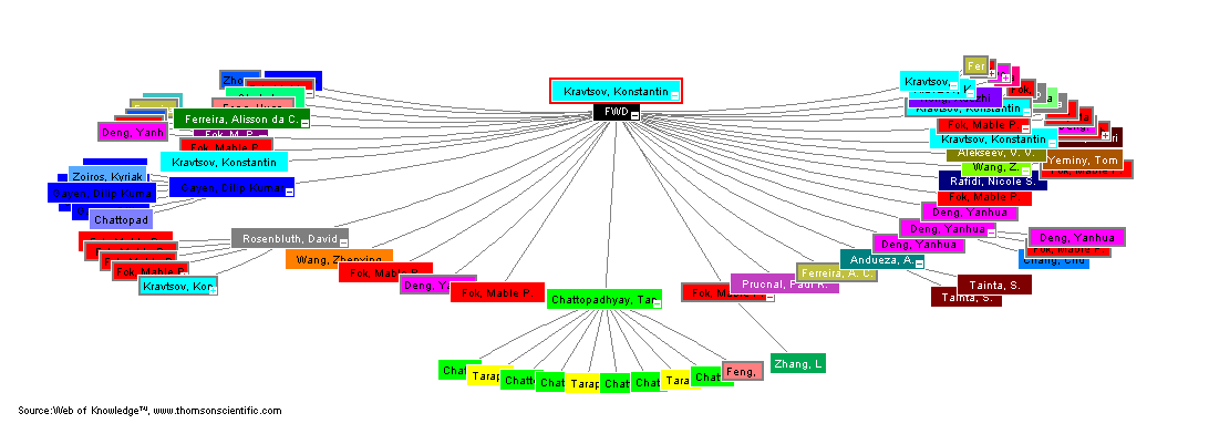 Карта цитирования статьи Константина Кравцова, полученная с помощью сервиса Web of Science (нажмите на изображение, чтобы посмотреть в полном размере). На иллюстрации выше использован фрагмент карты цитирования статьи Константина Кравцова (Simple nonlinear interferometer-based all-optical thresholder and its applications for optical CDMA. Author(s): Kravtsov, K (Kravtsov, Konstantin); Prucnal, PR (Prucnal, Paul R.); Bubnov, MM (Bubnov, Mikhail M.) Source: OPTICS EXPRESS Volume: 15 Issue: 20 Pages: 13114-13122 DOI: 10.1364/OE.15.013114 Published: OCT 1 2007), полученной с помощью сервиса Web of Science.