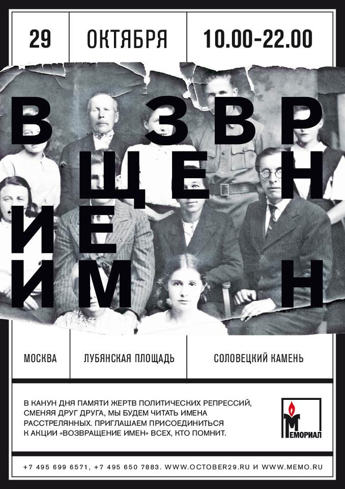 29 октября, в канун Дня памяти жертв политических репрессий, с 10 утра до 10 вечера участники ежегодной акции "Международного Мемориала", сменяя друг друга, будут читать имена людей, расстрелянных в Москве в годы Большого Террора.