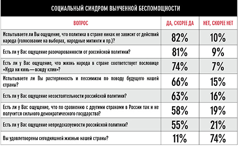 Количественные данные подтверждают полученные в фокус-группах предположения о неверии во власть и о социальном синдроме выученной беспомощности у российского населения.