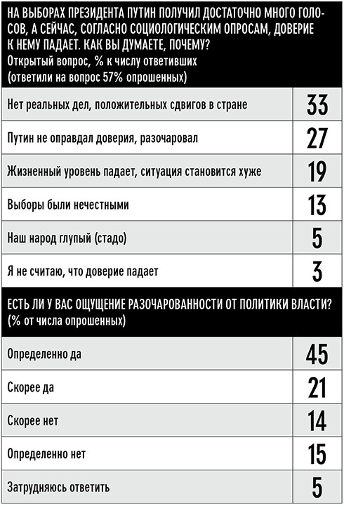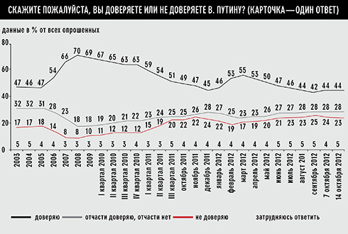 Нежелание перемен в худшую сторону, выбор «меньшего зла» привели к определенному повышению рейтинга в период президентской кампании /…/ После президентских выборов рейтинг доверия В.В. Путину начал устойчиво падать (с 55% в марте 2012 года и 44% во второй половине сентября 2012 года).