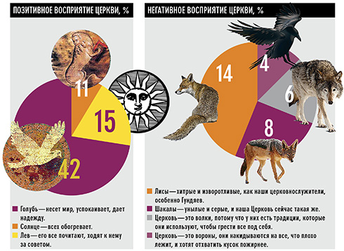 Об РПЦ Позитивное восприятие Церкви отметили 68%, негативное отношение — 32%. Таким образом, можно констатировать, что в отношении РПЦ массовое сознание оказалось расколотым на два неравнозначных по размерам лагеря с антагонистическими взглядами. И хотя по всем опросам большинство респондентов все еще доверяет РПЦ, в общественном сознании образовался значительный сегмент, придерживающийся противоположного мнения. Его потенциальные размеры могут составлять около трети взрослого населения. Формирование такого сегмента связано, по мнению самих респондентов, с огосударствлением Церкви и превращением ее в «новый партком».