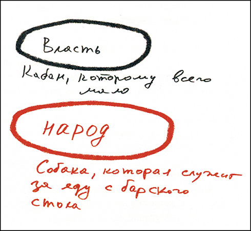 По данным тех же психологических тестов, можно говорить о том, что народ, как правило, чувствует себя жертвой — «власть волк — народ овцы», «власть орел — народ воробей», которую власть (безучастная, безответственная, несправедливая, нечестная, но в то же время активная, умная, волевая и злая) в любой момент может уничтожить.