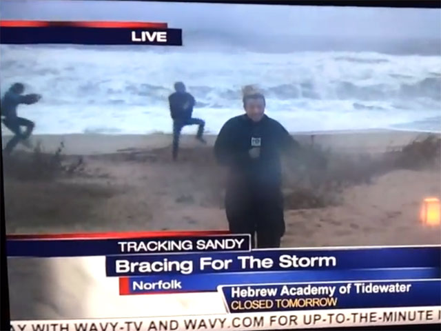 Сотрудница местного телевидения в Норфолке, штат Вирджиния, стоя на берегу моря, рассказывала, каковы последствия "Сэнди", отмечает The Huffington Post. Пока девушка сообщала, что на пляже почти не осталось песка, сзади нее в кадр вбежали двое подростков и исполнили танец южнокорейского певца PSY из посмотренного миллионы раз на YouTube клипа Gangnam Style.