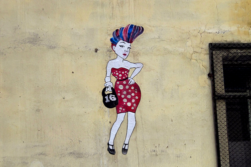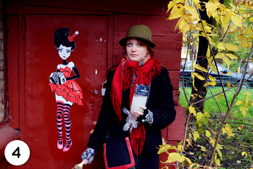 Авдотья Каблукова: "Я стараюсь максимально привязывать граффити к месту, чтобы прохожим было ясно, что происходит. Но при этом граффити лучше всего располагать как можно труднодоступнее, чтобы не стать добычей злого дворника. А вообще местом размещения могут быть какие-то интересные уличные объекты, трансформаторные будки, скамейки, киоски, стройки. Ровных стен вам!"