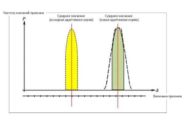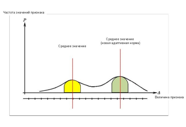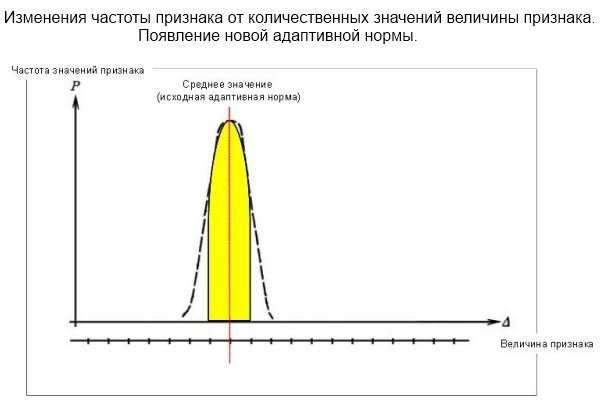 Возможно, рано или поздно в какой-то из частей этого разнообразия какой-то из уклоняющихся фенотипов окажется адаптивным, и по нему начнется отбор. В итоге он останется один и вернется по встречаемости к тому уровню, на котором была старая норма, но новая норма будет уже иметь другие параметры (другой фенотип). Это показано на основе экспериментальных данных. На математических моделях именно так и идет преобразование. Вывод - в критической ситуации перестает работать канализирующий отбор, потому что нет оптимума среды и, соответственно, множество аберраций остаются живы. И какая-то из них оказывается адекватна данным параметрам среды. Однако при этом значительно снижаются общие адаптивные возможности всей популяции.