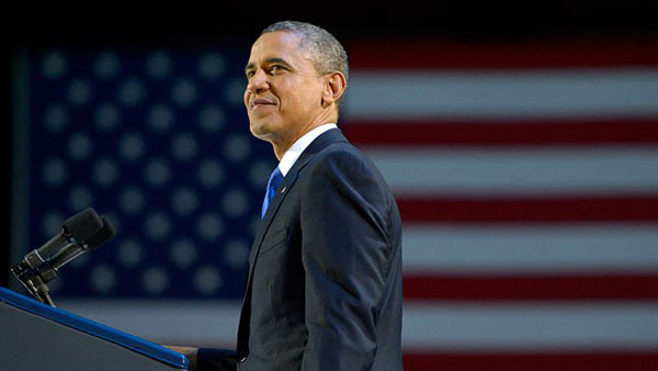 Барак Обама. ноябрь 2012. Фото: whitehouse.gov После частностей он снова переходит к более общему и благодарит свой предвыборный штаб за помощь в отстаивании своих идей. Здесь появляется первое расхождение.