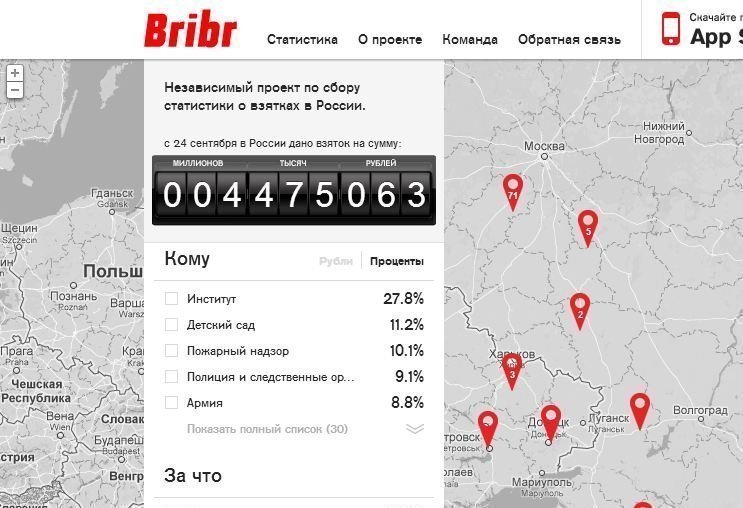 Пока очень мало. Данных для полноценной статистики, конечно, на данный момент недостаточно, - мы надеялись, что будет больше. С другой стороны, проект совсем молодой, мы долго никому не говорили о нем, никак не пиарили его. Когда данных о взятках, которые шлют нам пользователи, накопится побольше, станет гораздо интереснее. Пока это скорее просто курьезная, любопытная информация.... но в то же время приходит очень много обратной связи, люди пишут письма с целыми историями, рассказывают, как их принуждали к коррупции. Даже один китаец написал, как его в аэропорту Пулково заставляли давать взятки. Это очень трогательно. Поэтому сейчас мы больше думаем об обновлениях приложения - в середине ноября появится новая версия, где будет возможность добавлять комментарии.
