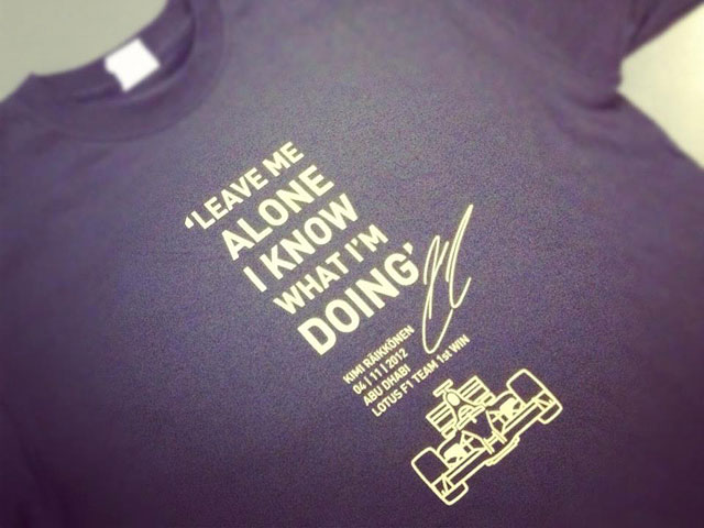 Победитель Гран-при Абу-Даби Кими Райкконен сделал необычный подарок сотрудникам команды, прислав на базу Lotus F1 в Энстоуне 500 футболок с надписью "Leave me alone, I know what I'm doing" ("Оставьте меня в покое, я знаю, что делаю"), сообщает F1News.ru.