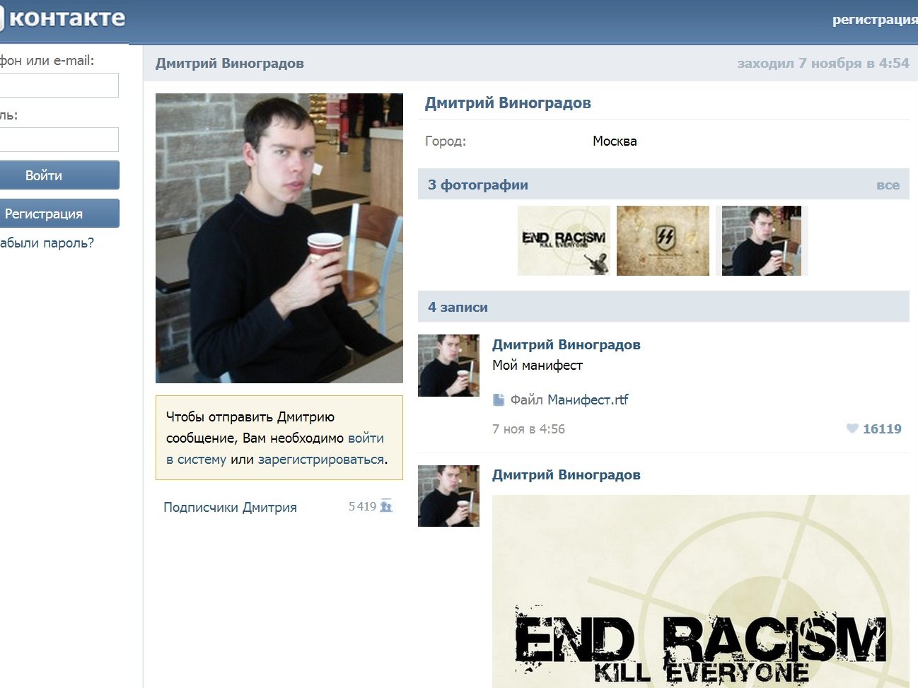 Обращение в Федеральную службу по надзору в сфере связи, информационных технологий и массовых коммуникаций направила прокуратура Москвы из-за «человеконенавистнических призывов и высказываний, а также ряда фотографий». Речь идет о так называемом манифесте «русского Брейвика», который Виноградов разместил на своей странице в открытом доступе за несколько часов до расстрела. В нем Виноградов высказал свои мизантропические взгляды. При этом манифест собрал более 16 тысяч лайков. Кроме того, Виноградов опубликовал расистские изображения.