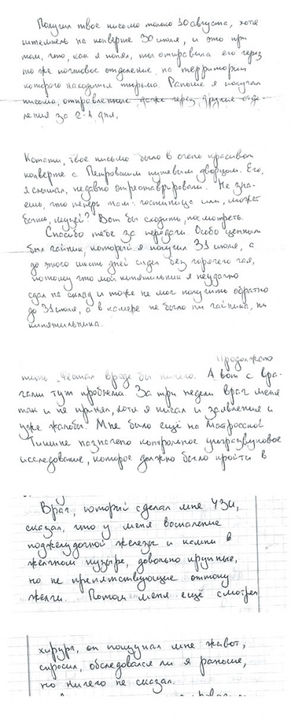 Меня арестовали инвалидом, и потом мое состояние только ухудшалось и ухудшалось. И последние два года они меня вынуждены были держать в больнице тюрьмы Матросская Тишина. Я лежал и лежал там. Они все время меня хотели выписать обратно в камеру. Они так со всеми поступают. Если человек долго не выздоравливает, они сталкиваются с проблемами.
