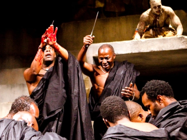 Спектакль начинается непривычно. Под звуки там-тамов зрители входят в зал, занимают места, а на сцене, как будто бы не обращая внимания на публику, своей жизнью живут артисты. И так же органично, без особых приготовлений, они как-то незаметно превращаются в героев шекспировской трагедии, рассказывающей об истории заговора против Цезаря, о его убийстве и о поражении заговорщиков. Правда, действие происходит не в Древнем Риме, а в современной Африке. Так задумал режиссер спектакля - новый худрук Королевского Шекспировского театра Грегори Доран.