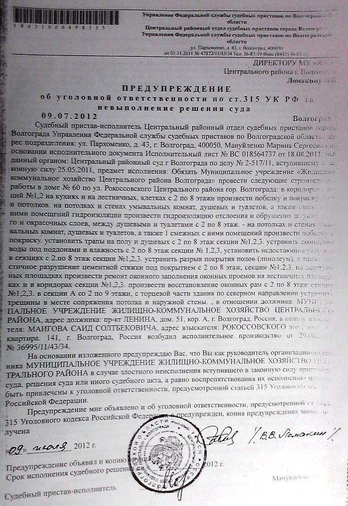 Ждут кто окажется первым — власть, которую суд обязал отремонтировать аварийное общежитие, или же стихия, которая подмоет фундамент и обрушит на их головы арматуру и кирпичи… Пока выигрывает стихия, а вот власть всеми силами старается не замечать проблемы, переписываясь бумагами, в которых чиновники утверждают, что "…По информации Центрального территориального управления департамента финансов администрации Волгограда, расходы на ремонт здания включены в проект плана бюджетного финансирования на 2013 год", и предупреждениями, где исполнители решений суда — судебные приставы — "грозят пальчиком" нерадивым чиновникам и уже год предупреждают их об уголовной ответственности по 315 статье УК…