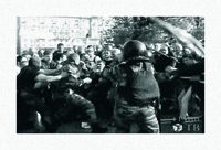 Перед цепочкой демонстрантов мужчина с бородкой и в белой рубашке держит за голову склоненного омоновца — Александра Казьмина. За спиной мужчины стоит Михаил Косенко — в красной рубашке и черной куртке, одной рукой он как будто придерживает омоновца. Тут же слева подлетает качок в черной маске, который хватает Казьмина за шею и валит на асфальт — это Максим Лузянин. Видно, что Косенко тянется за омоновцем, но разобрать, наносит ли он ему удар, невозможно: кадр заслоняет другой боец ОМОНа. Все эти события, заснятые оператором «Граней-ТВ» на Болотной площади 6 мая, длятся около десяти секунд. Именно на этот ролик, а также на показания свидетелей-полицейских ссылаются следователи. По их мнению, Лузянин и Косенко вместе с другими «неустановленными лицами» сорвали с бойца Казьмина шлем противоударный «Джета», бронежилет «Кора-Кулон», отняли специальное средство — резиновую палку (ПР-73М), изделия «Щиток», «Пояс» и БР, а также противогаз «ГП 8В», нанесли «множественные удары руками и ногами по голове и телу».