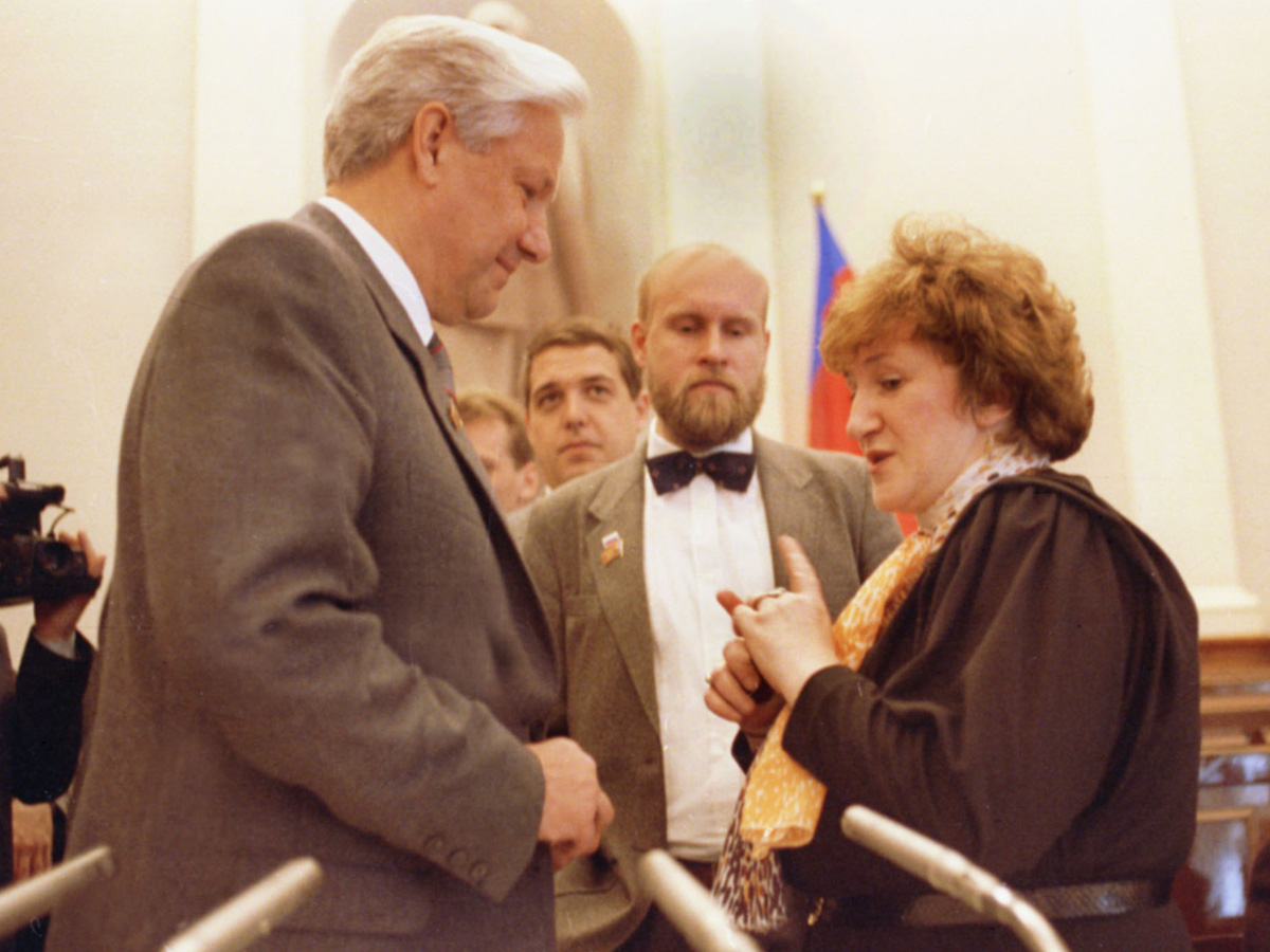 Старовойтова была в это время депутатом Верховного Совета Народных Депутатов, членом Межрегиональной группы. Хотя она родилась в Челябинске, а выросла и практически всю жизнь прожила в Ленинграде, избрали ее от Армении: будучи этнографом, она проводила там много времени, а когда начался конфликт в Нагорном Карабахе, стала писать письма и выступать в защиту армянского народа — тогда, собственно, и превратилась стремительно из ученого в политика. Когда в июне 1991-го года Ельцина избрали президентом России (пост с непонятными тогда полномочиями), Старовойтова стала одним из его ближайших советников: официально она консультировала его по вопросам межнациональных отношений, неофициально — и по всем остальным, включая состав правительства. В 1992-м Ельцин всерьез рассматривал возможность назначения Старовойтовой министром обороны. Назначить на эту должность не просто гражданского человека, но женщину, придерживающуюся почти пацифистских взглядов — это был бы поступок в стиле раннего Ельцина, сигнал, что действительность изменилась до неузнаваемости. Ельцин, однако, назначил Павла Грачева.
