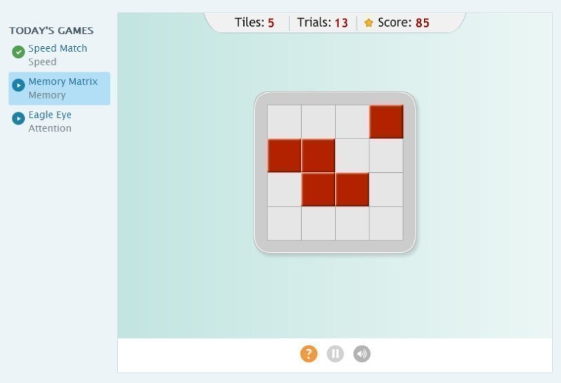 Игра "Memory Matrix" Научной базой Lumosity являются исследования последних лет, говорящие о возможности нашего мозга перестраиваться на протяжении всей жизни. Пластичность синапсов, соединяющих нейроны, позволяет нам запоминать новую информацию и осваивать незнакомые навыки. Важным фактором, влияющим на качество и скорость обучения, является новизна и сложность поставленной задачи - мы должны столкнуться с проблемой, к которой мы не привыкли в обычной жизни. Множество задач в реальной жизни требуют вовлечения целой сети связанных когнитивных процессов, поэтому эффективное развитие интеллектуальных способностей возможно только при комплексной тренировке.