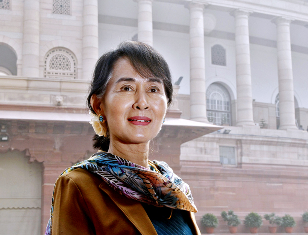 Глава оппозиционной партии Бирмы, выступающей против военной хунты. Дочь одного из самых известных бирманских борцов за независимость. Провела под домашним арестом 15 лет. В 1991 году получила Нобелевскую премию мира.
