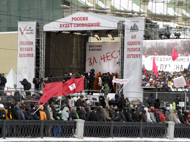 Отметим, что февральское шествие оппозиции по Якиманке завершилось митингом на Болотной площади, несмотря на двадцатиградусный мороз. Тогда протестующие даже черпали в погоде вдохновение и выходили на шествие с плакатами: "А мы пингвинчики, а нам не холодно" и "Мы стали более теплее одеваться".