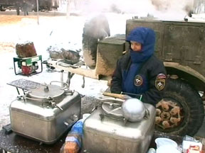 Полевая кухня. Кадр: vesti.ru Водители во встречном направлении в свою очередь подтвердили, что движение в сторону Москвы началось около 9 утра, однако поток машин постоянно останавливается по различным причинам. В МЧС позже пояснили, что сотрудники ГИБДД планово приостанавливают движение для прохода снегоуборочной техники, однако эти остановки не превышают 30 минут.