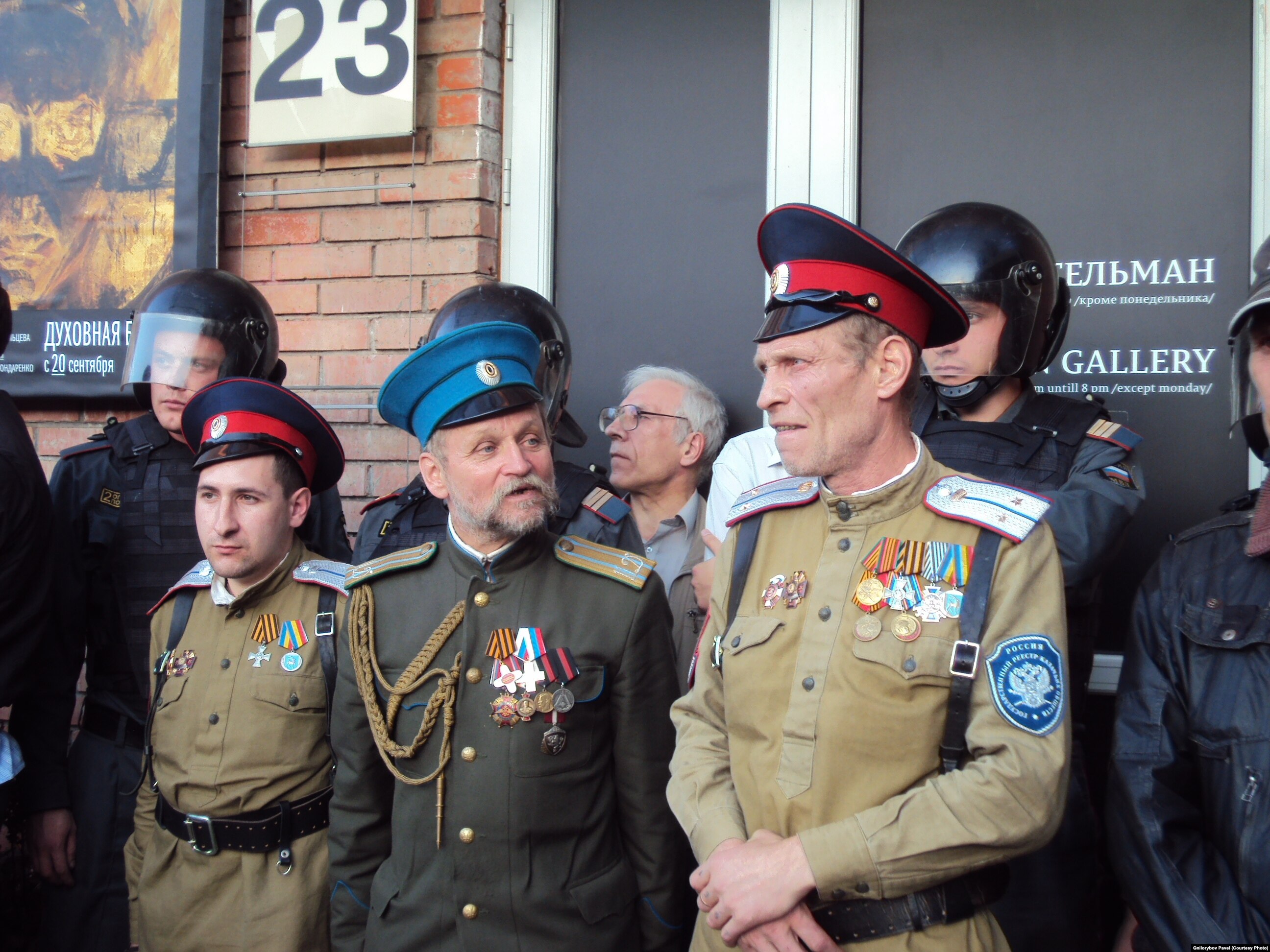 – Да, конечно, я был там 20 сентября, но ведь что произошло: когда пришли граждане, дававшие до этого объявления в социальных сетях «братья и сестры, безбожники хотят открыть выставку с хулой на святые образы Спасителя, Троицы Сверхсвятой, … для того, чтобы не допустить ее открытия, нужна помощь каждого из нас… Кто может дать канистру?» – так вот, когда ровно в шесть вечера их колонна, сопровождаемая фотографами и журналистами, вошла на территорию Винзавода, и они попытались пробиться в галерею, чтобы устроить там погром, подобный тому, который был учинен в январе 2003 года в Сахаровском центре, когда была разгромлена выставка «Осторожно, религия», охрана, приглашенная для того, чтобы на выставке был порядок, погромщиков внутрь не пустила. Потенциальные погромщики живой цепью заблокировали вход в галерею, однако вызванный на территорию «Винзавода» спецназ полиции оттеснил погромщиков и встал между ними и входом в Галерею. В результате мы, находясь в галерее, оказались блокированы: с одной стороны, спецназ охранял нашу безопасность, с другой стороны, никто не мог выйти на улицу: ни представители прессы, ни художники. На вернисаж пришли такие достаточно известные художники, как Константин Худяков, Лена Хейдиз, Антон Николаев, были общественные деятели: Владимир Голышев, Александр Подрабинек... Я сам достаточно долго видел только то, что происходило внутри галереи, потому что выйти из нее было невозможно никак. Более того: те люди, которые пытались пройти, будучи приглашенными лично организаторами выставки, не только не могли зайти в Галерею Гельмана – никто не мог войти вообще на территорию «Винзавода»; яркий акционист Денис Мустафин попал внутрь только благодаря тому, что перелез через забор, но таким путем пробился, насколько я знаю, лишь он один. Причем, несмотря на то, что к семи – началу восьмого вечера спецназ полиции вроде бы разогнал тех, кто пришел громить выставку, закрыв «Винзавод», когда мы, несколько человек, вышли во двор, то Виктор Бондаренко был облит, к счастью, водой, а не кислотой. Вот этот факт нападения, это, к сожалению, – не какая-то пиар-акция, не какая-то шумиха, я стоял в метре от организатора и идеолога выставки и видел это нападение на него своими глазами. Но большую часть того, что происходило у входа в Галерею с шести до семи вечера я сам увидеть не мог, потому что мы были заперты, и поэтому я очень благодарен фотографам, ставшим свидетелями происходившего и безвозмездно передавшим свои материалы для публикации.