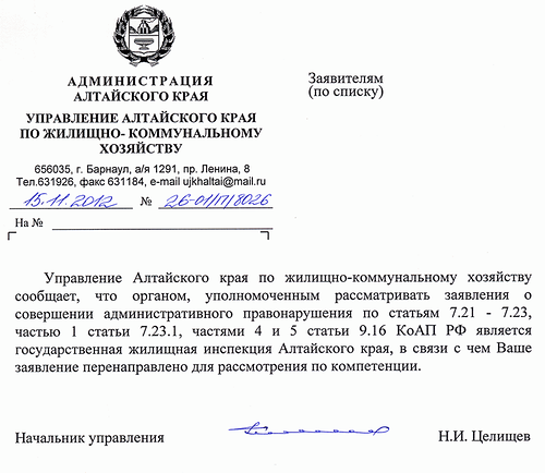 15 ноября мне пришел ответ от Управления Алтайского края по жилищно-коммунальному хозяйству: