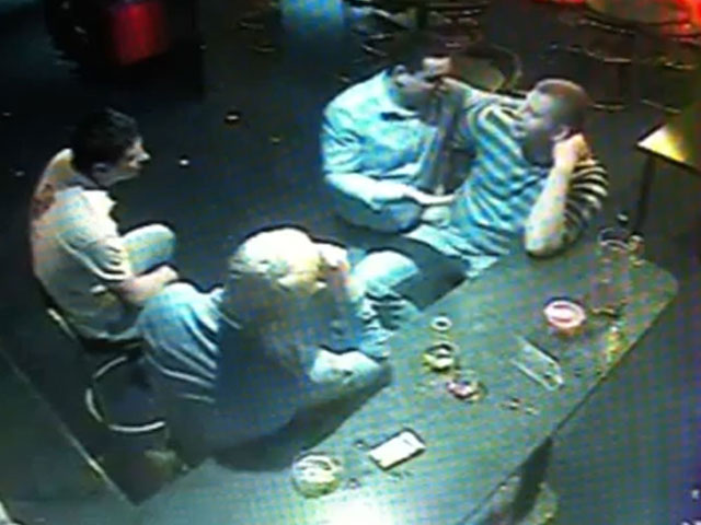 На записи видно, как четверо молодых мужчин сидят за столиком в баре и о чем-то оживленно беседуют. Затем один из них встает и бьет по лицу другого. Завязывается потасовка, приятели пытаются их разнять, клубок дерущихся перемещается в дальний угол, куда не достает око видеокамеры. Спустя несколько мгновений двое - зачинщик драки и его приятель, разнимавший дерущихся, - возвращаются под камеру. Один из них отталкивает рукой неизвестного мужчину, который до сего момента на видео не попадал.