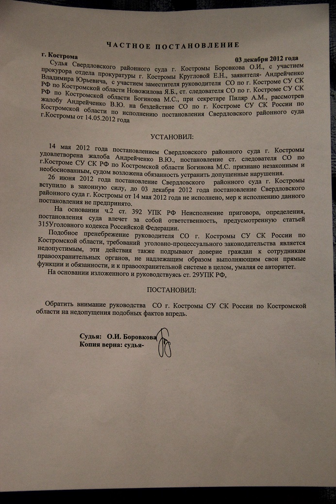 Тогда Андрейченко обжаловал действия СК в суде. В июне 2012 года суд признал незаконными действия следователя СК Богинова и обязал его устранить нарушения, однако Богинов решение суда не выполнил, сославшись на то, что решение суда в СК "не поступало".