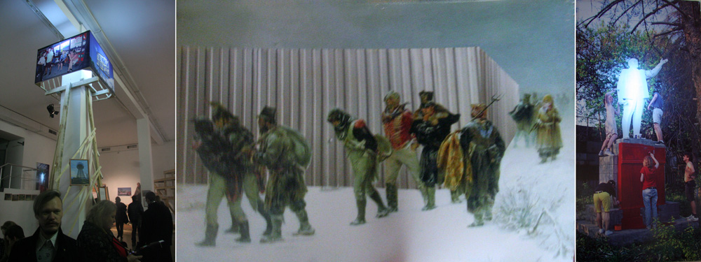 Было ли прошлое народа великим и какое это имеет значение сейчас? Национальность и возраст художника оказываются очень важны – не для розни, но для анализа проблем и их решения. Угадывая по фамилиям авторов все же национальность по «крови», понимаешь различные точки зрения. Алексей Шиндлин в работе «Атавизмы» берет атрибуты современного гастарбайтера из Средней Азии – поношенные джинсы и рабочие рукавицы, пробки от Кока-колы и аудиокассеты, и «втаптывает их в традицию», превращая в узоры на войлочных коврах. Это похоже на то, что у нас в России - сочетание капитализма и язычества. Для Ербола Мельдибекова важен советский период как тоталитарный и в то же время показывающий, что подавление свободы проходит насквозь от корней к будущему. Рустам Хальфин в видео «Любовные скачки» «воссоздает сюжеты «возможной казахской античности», брачные обычаи кочевников со старинных китайских миниатюр. Соитие-не-сходя-с-коня героизирует кочевников больше, чем легенды об их славных военных победах. Видео показывает зажатому, закомплексованному горожанину настоящую («природную») романтичность, красоту и эпический масштаб любви «степных людей». Казахстанский художник татарского происхождения видит поэзию бескрайних степей – общее для его личного прошлого и его настоящего.