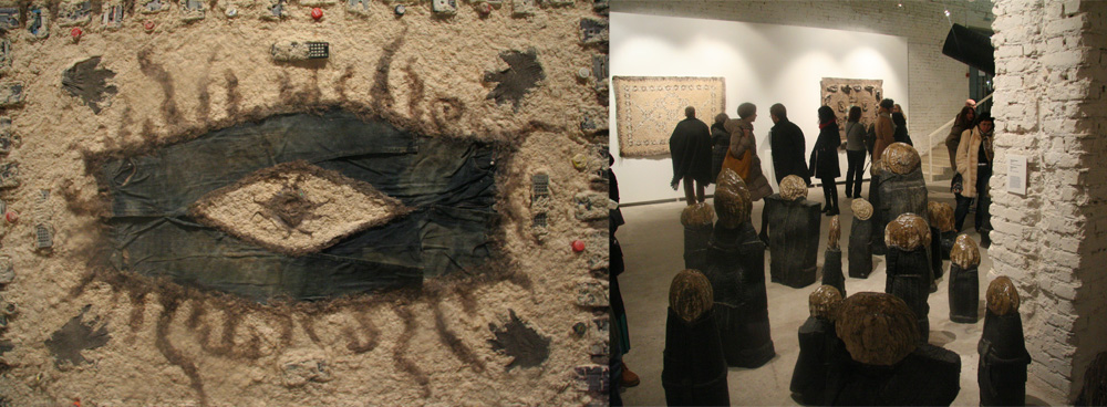 Фрагмент работы Алексея Шиндина из серии "Атавизмы", «Балбалы» Молдакула Нарымбетова. Выставка "Современное искусство Казахстана" в проекте Марата Гельмана "Культурный альянс" на Винзаводе.Вся экспозиция выстроена как единая композиция, где все рифмуется. В центре зала вокруг колонны выстроились «Балбалы» Молдакула Нарымбетова: фигуры, похожие на толпу людей, заполнивших галерею. Их головы сделаны из камней, обточенных горной рекой в форме колес, а тела – из автопокрышек. Прирожденные кочевники остановились, колесо стало символом, неподвижным идолом – но как природа горной реки вытачивает лежачий камень в форме колеса, так и природа историческая точит современное стремление кочевого народа к оседлости. Что-то есть в этом от одного из реди-мейдов Дюшана - велосипедного колеса, зафиксированного на табуретке – и не усидишь, и не поедешь.
