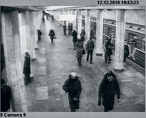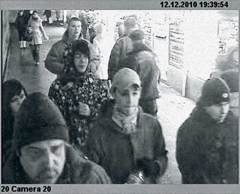 | Михаил Кузнецов и Илья Кубраков в переходе станции метро «Коломенская» 12 декабря 2012 г. Кадр из записи камеры наблюдения | Борода выходит из станции метро «Коломенская» 12 декабря 2012 г. Кадр из записи камеры наблюдения |