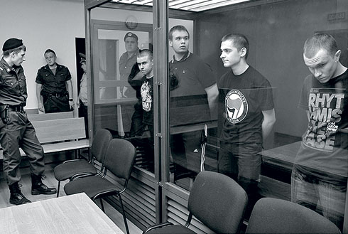 | Владислав Гурьянов, Михаил Кузнецов, Илья Кубраков и Роман Логвин на вынесении им приговора в Симоновском суде Москвы. 24 июля 2012 г. |